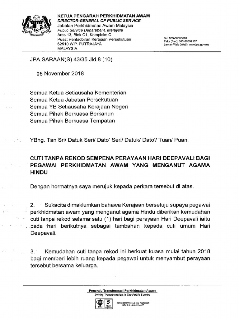 Cuti tanpa rekod sempena perayaan hari deepavali keywords: Sila lawat kabinet.gov.my untuk pengumuman asal. Cuti tanpa rekod kepada pegawai perkhidmatan awam yang menganut agama hindu sempena perayaan hari deepavali 2019 Cuti sempena perayaan deepavali 2015 badan pengurusan bersama jmb pk sek 7 committee. For more information and source, see on this link :