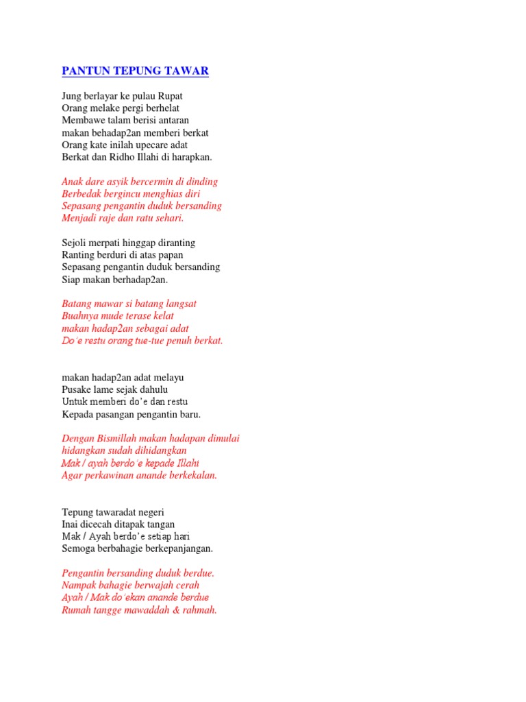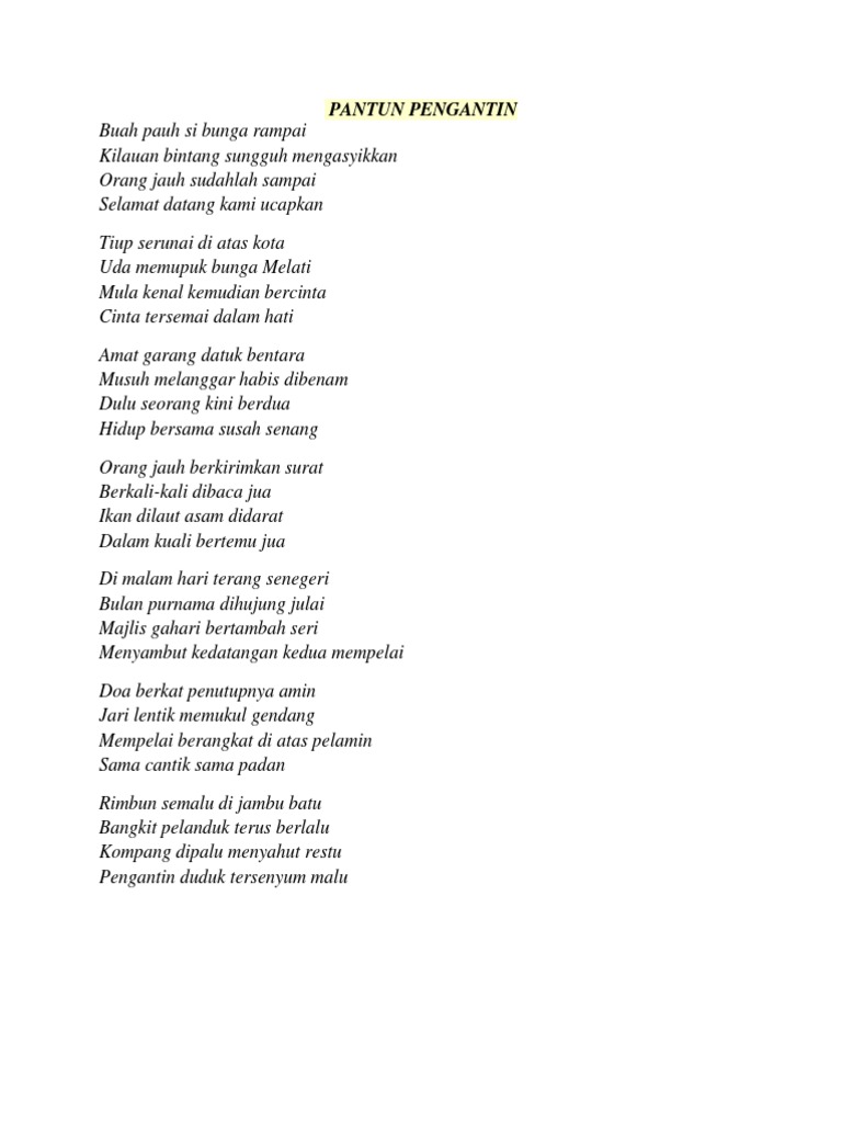 Ujung pandang banyak bertemu, tepi laut langitnya biru. Masa bertunang bukan main sopan, lepas bersanding terus menerkam. Misalnya suku melayu, minang kabau, jawa, maupun sunda dan betawi. 1 pantun untuk pernikahan dikumpul ding choo ming pantun juga digunakan dalam majlis pernikahan, bermula dari merisik sampai kepada memberi nasihat kepada pasangan pengantin baru. Langit membentang warnanya biru datang hujan menimpa batu selamat menempuh hidup baru