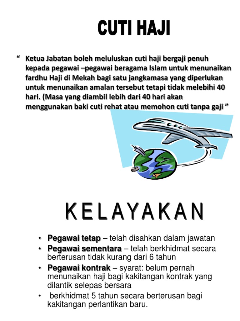 Related : Pekeliling Cuti Menunaikan Haji - Ketua Jabatan Boleh Meluluskan Cuti Haji Bergaji Penuh Kepada Pegawai Pegawai Beragama Islam Untuk Menunaikan / 13 aturan penting lain yang perlu diperhatikan berkaitan dengan pekerja yang hendak menunaikan ibadah haji adalah sebagaimana diatur dalam pp no..